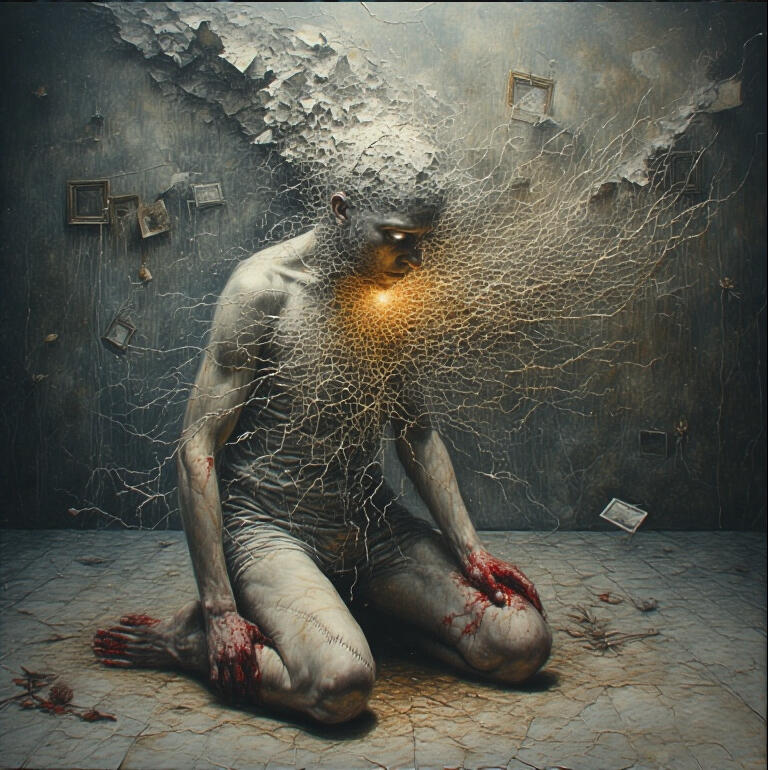 This is collapse born not of failure but of presence—of witnessing too much with too much love and too little power. The self here is not erased but overloaded, holding sorrow that doesn’t belong to only one person. Isolation is sharpened by intimacy: being close, but helpless. The narrative thread doesn’t break—it frays silently, with your hands still holding the spool.Future-casting practice: