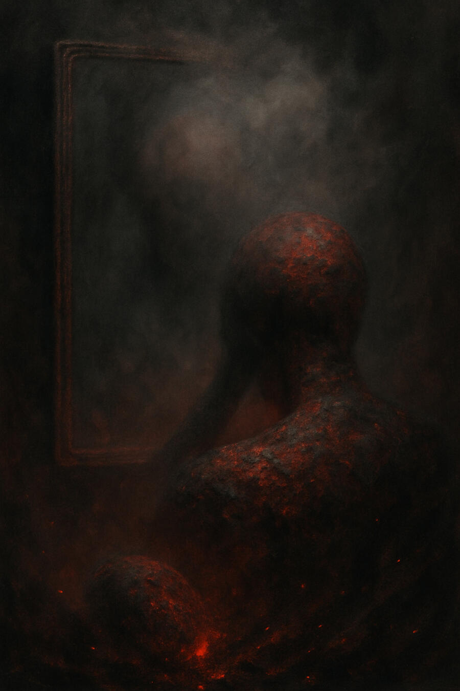 This is not collapse into fragments, but collapse into form. The lava rock does not scream — it holds. The mirror blocks, yes — but it also shelters. This may be an ending that carved out space. The self did not disappear. It crystallized, obscured but intact, waiting for air to cool and meaning to catch up.Future-casting practice: