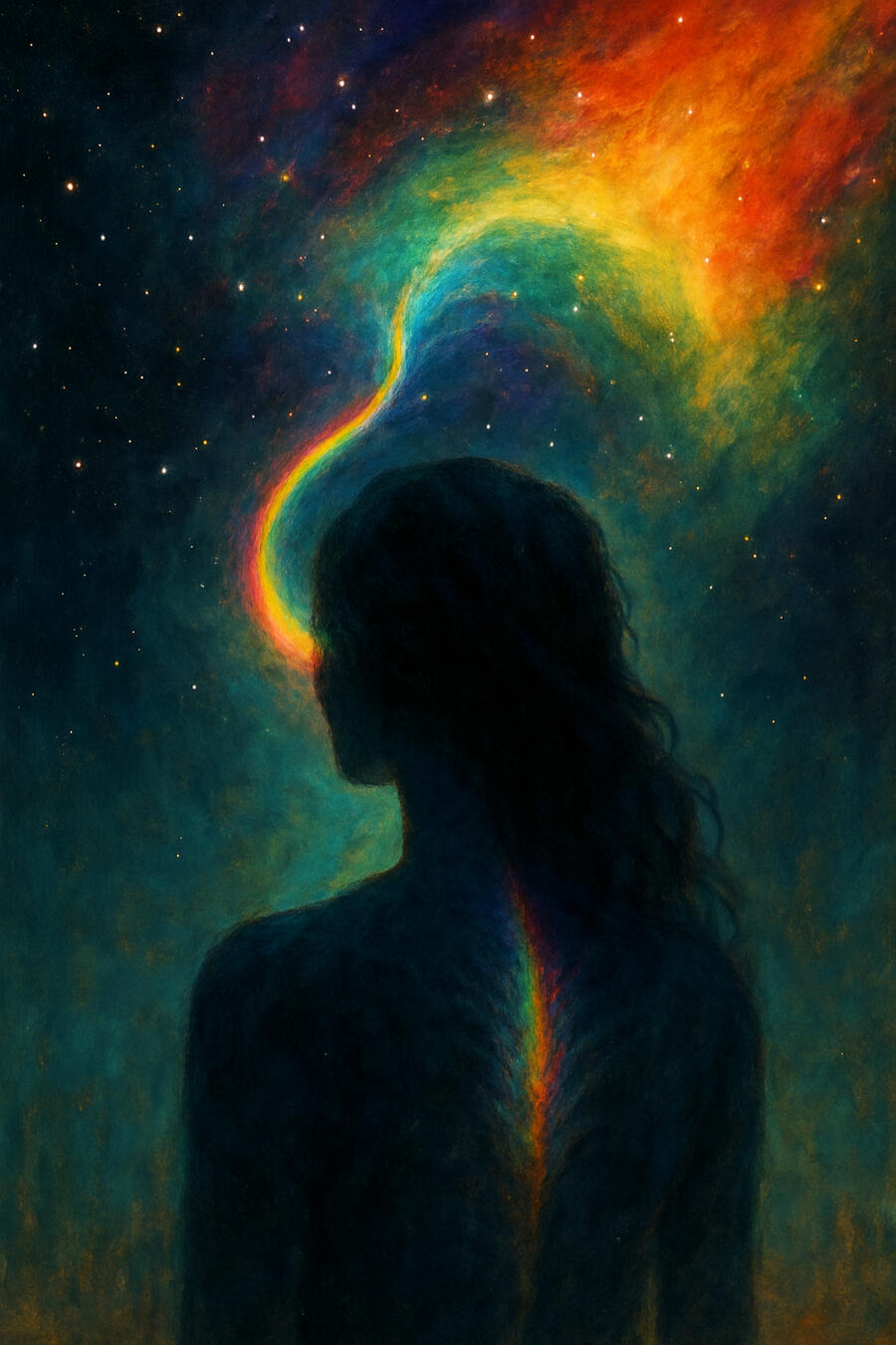 A rainbow pulses behind closed eyes, not symbolic, but real — a signal from something you haven’t reached yet that somehow already knows your name.