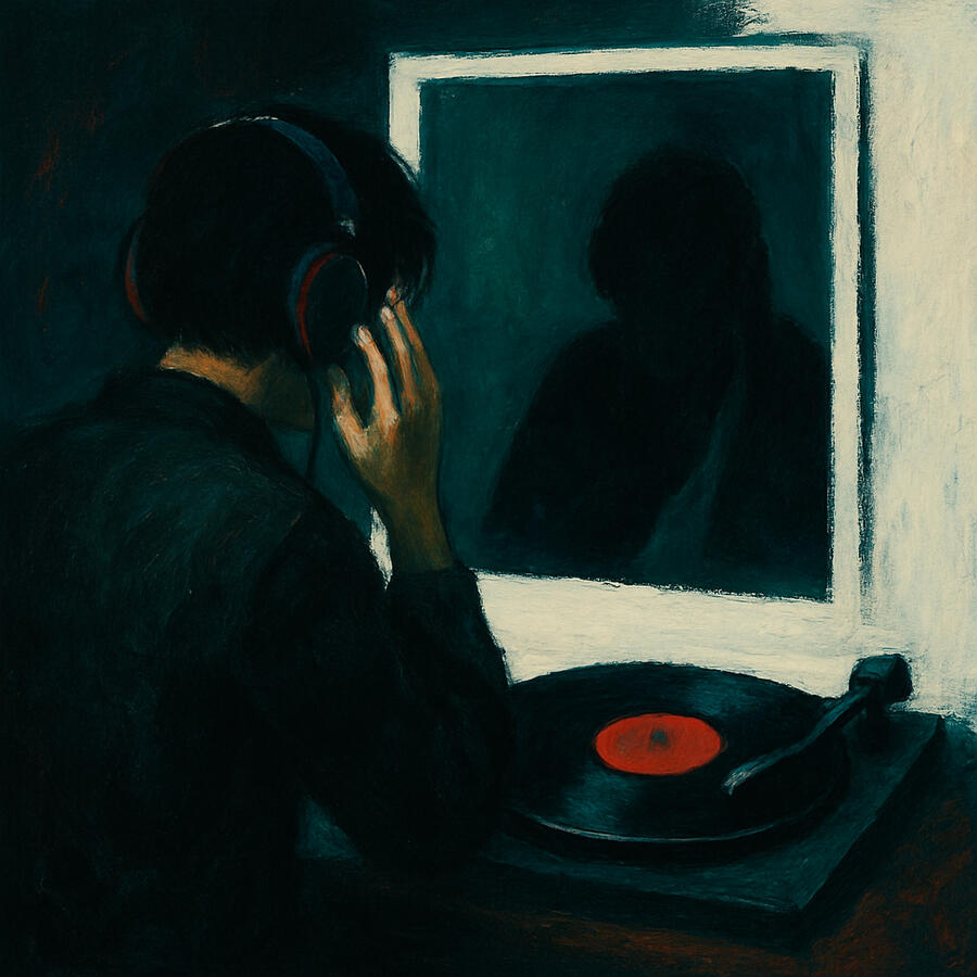 A figure sits with headphones on, surrounded by silence broken only by sound. The mirror across the room holds their gaze, though the face it shows is slouched lower, wearier. Between them, music crackles like breath across a record. The white wall around the glass almost glows—fragile, like the edge of a transformation not yet made.Narrating Identity Questionnaire (NIQ)